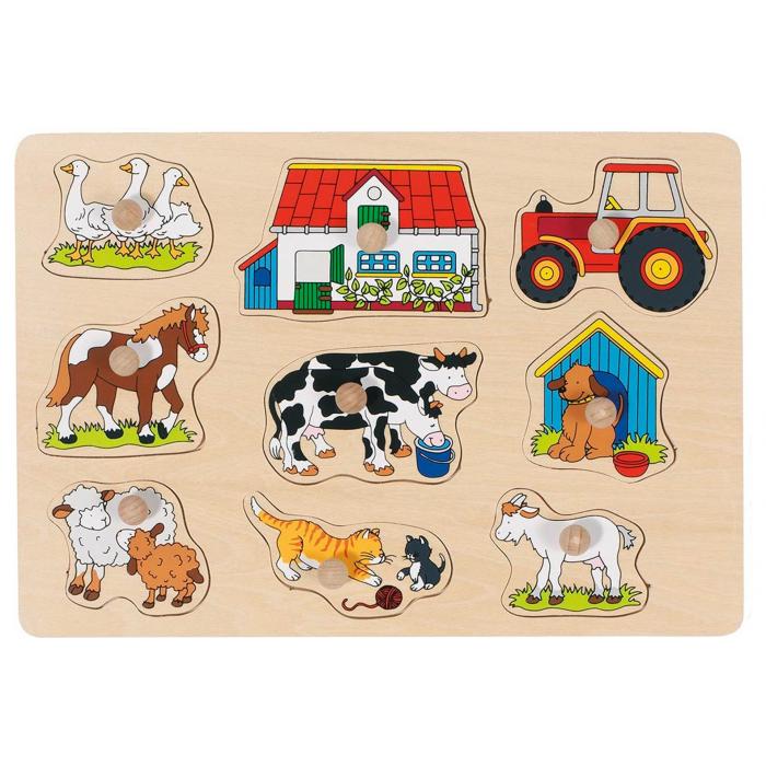 Страхотен пъзел ферма за най-малките. С него ще се научат да различават форми и да поставят отделните части на подходящите места. Прекрасните картинки, сред които крава, куче и котка, са идеална възможност да разкажете безброй истории на децата. Пъзелът се състои от 8 части и е изработен от дърво, което го прави много издръжлив - колкото и да играят децата с него, ъгълчетата няма да се огънат. Дървената основа е с дебелина 8 мм. Дървените пъзели с дръжки са предназначени за деца от около 2-годишна възраст и развиват техните първи умения като фина моторика, координация око-ръка и логическо мислене.